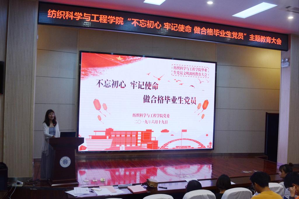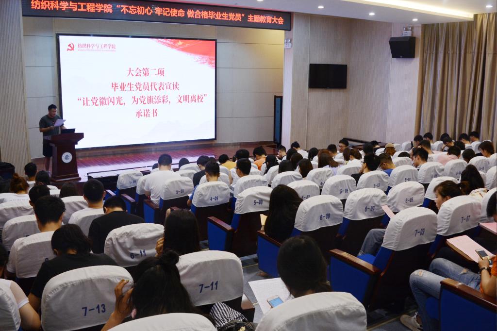 2019年6月19日,伟德国际victor1946在金花校区西纺报告厅召开“不忘初心、牢记使命,做合格毕业生党员”2019届毕业生党员文明离校主题教育大会,公司党委副书记郭西平、党委委员员工工作办公室主任赵勇进、辅导员曹鑫以及来自研究生、本科生13个党支部的122名毕业生党员参加了大会。赵勇进主持大会并致辞。