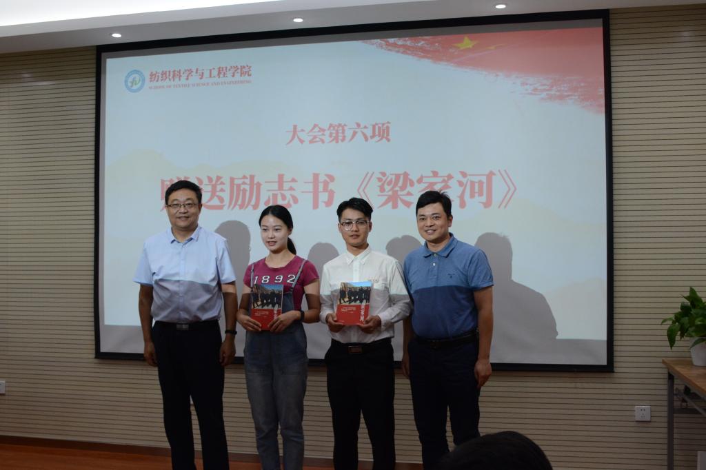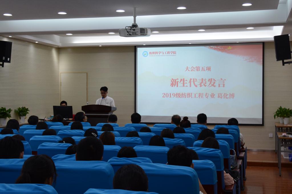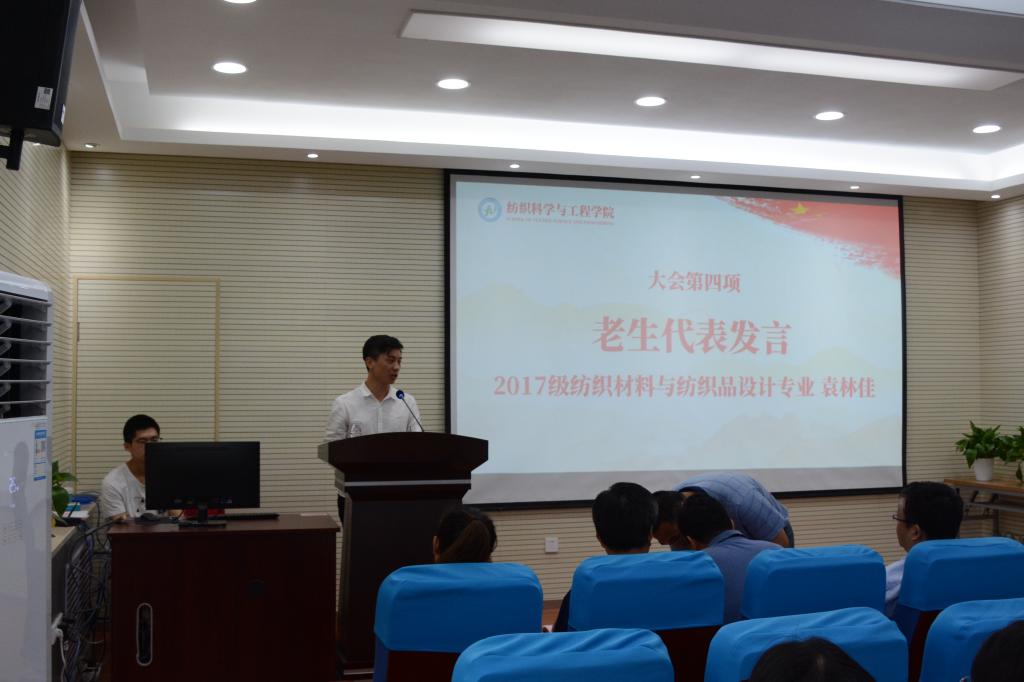 研究生国家奖学金获得者、2017级纺织材料与纺织品设计专业袁林佳同学,2019级纺织工程专业葛化博同学分别代表老生和新生发言。