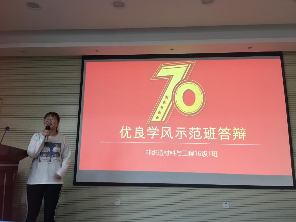 答辩会以2016级纺织工程2班的PPT展示开场,班长彭江伟用富有激情的语言展示了班级风采中,班级活动合照展示了独有的青春与活力,数据统计图有力地展示了班级取得的优良专业成绩。随后上台参加风采展示的其他班级也不甘落后,数量众多的个人与班级荣誉证书、奖状等显示了他们在德智体美等各个方面取得的优异成果。最后进行答辩的2018级非织造材料与工程1班以认真端正的态度和班团默契的合作给现场评委留下了深刻印象。班级风采逐个展示过后,评委老师针对各班的实际情况作了相应的点评,提出了不少的“巧问”,亦得到了各班代表的“妙答”。经过激烈的角逐,综合各项评分标准,最后评选出2017级纺织工程5班为伟德国际victor1946“2018-2019学年优良学风标兵班”。