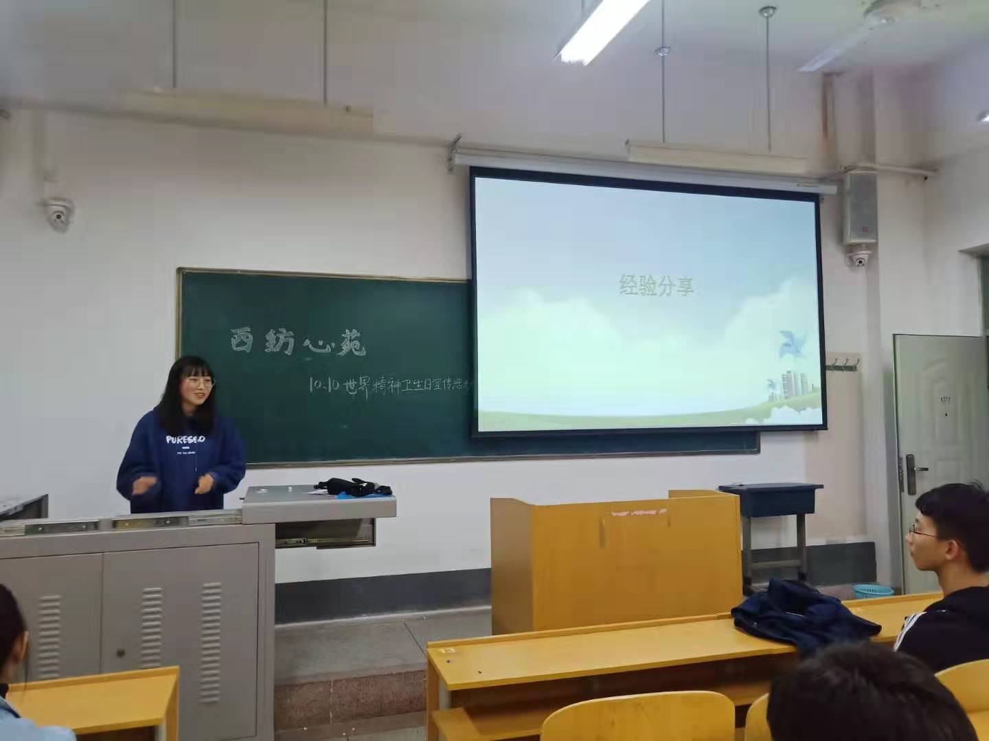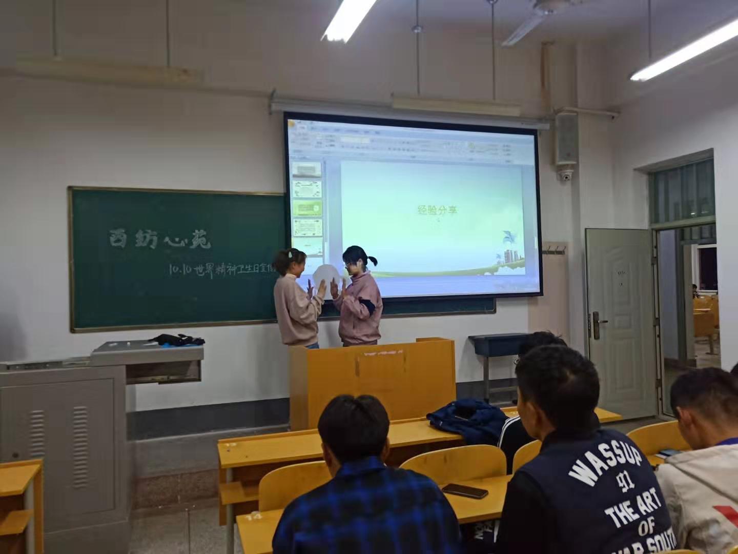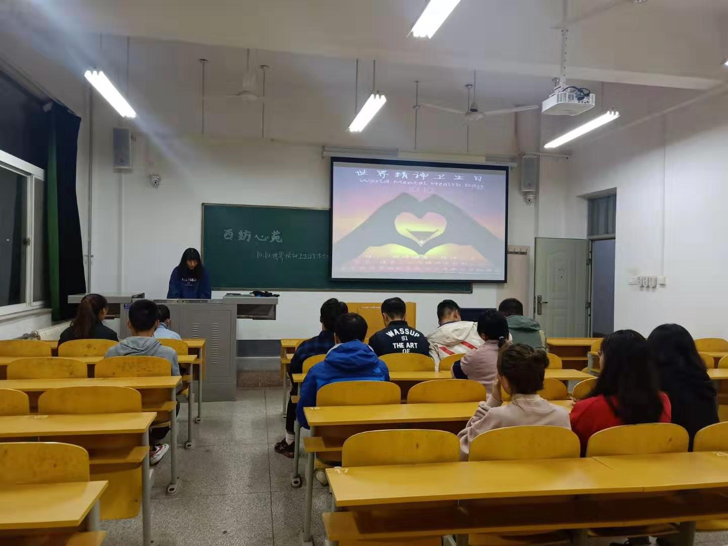 2019年10月10日晚上19点,伟德国际victor1946西纺心苑心理社团在c-176举办了以“共享健康资源,共建和谐校园”为主题的10.10世界精神卫生日宣传活动。西纺心苑社团全体成员及2018级、2019级各班心理委员参加此次活动。