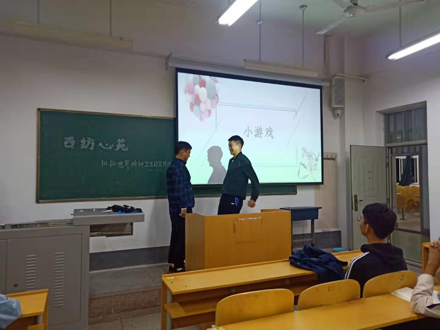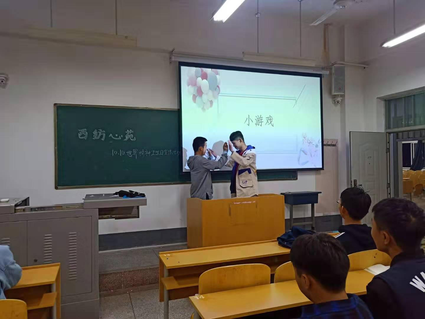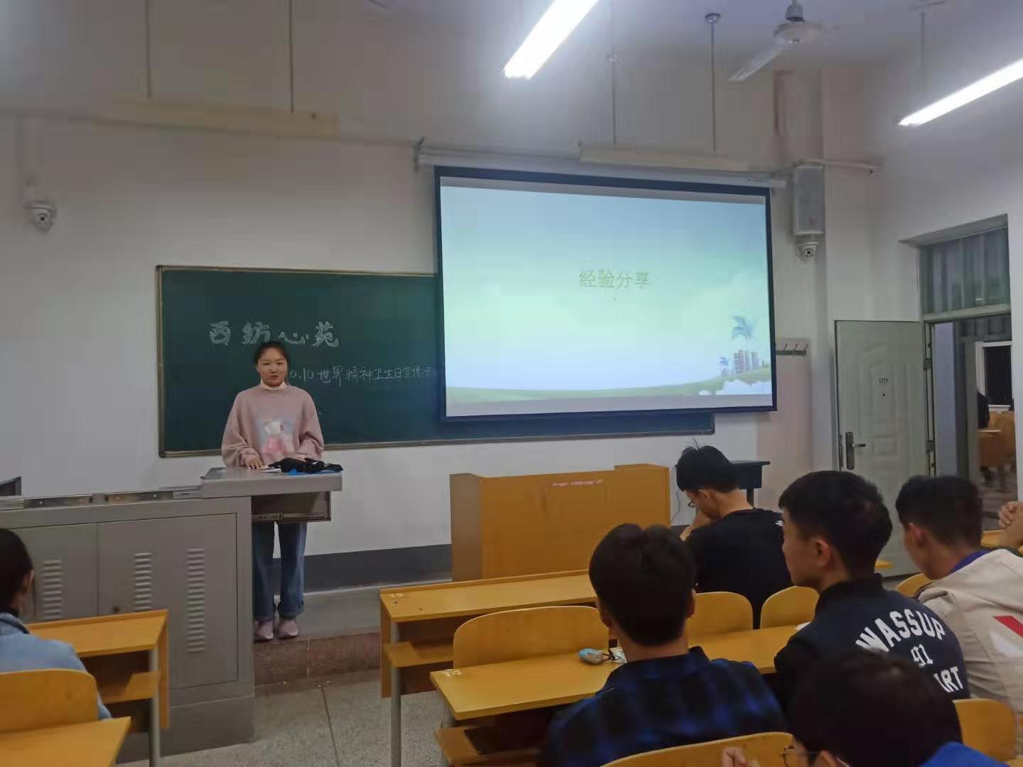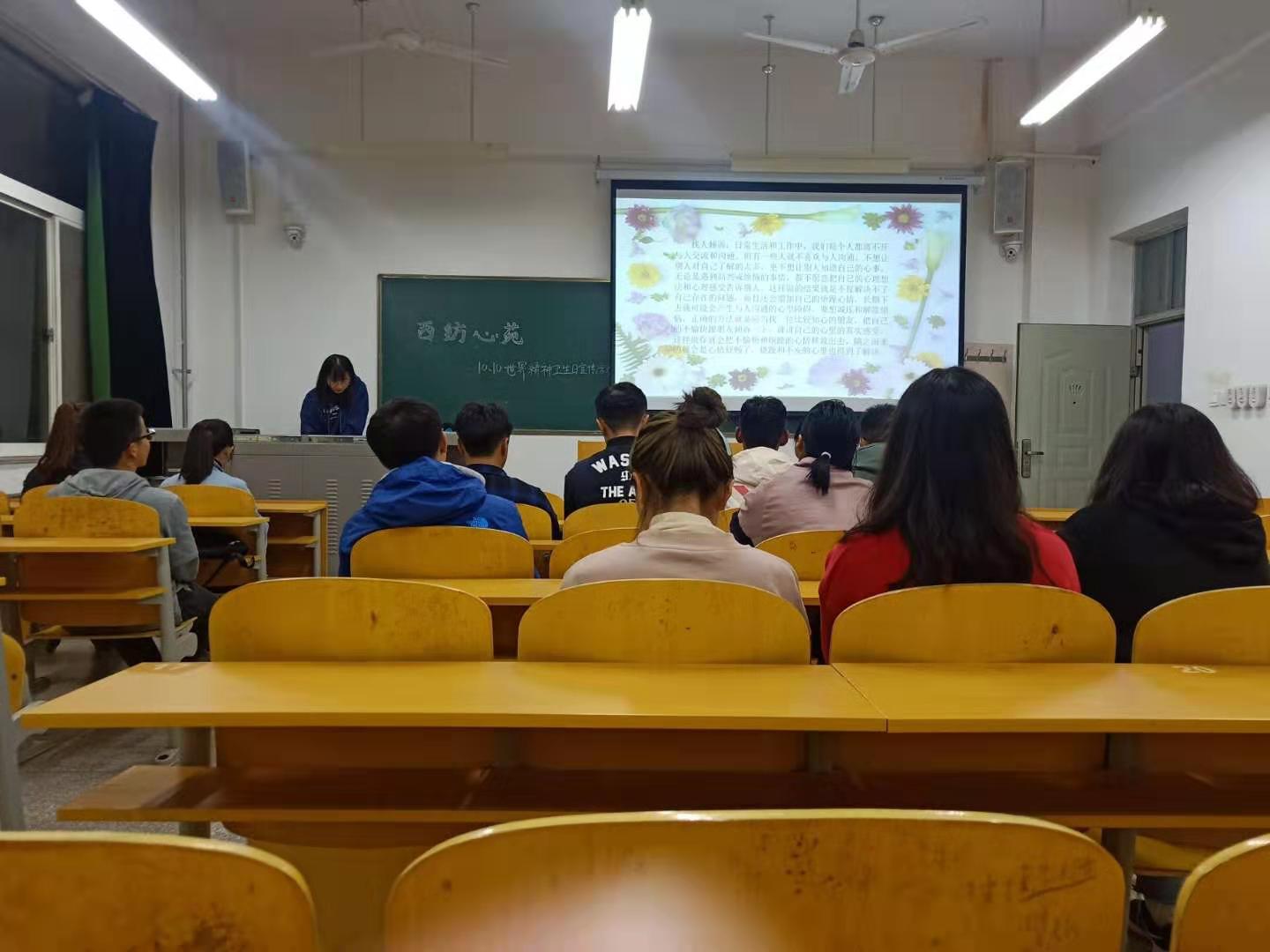 2019年10月10日晚上19点,伟德国际victor1946西纺心苑心理社团在c-176举办了以“共享健康资源,共建和谐校园”为主题的10.10世界精神卫生日宣传活动。西纺心苑社团全体成员及2018级、2019级各班心理委员参加此次活动。