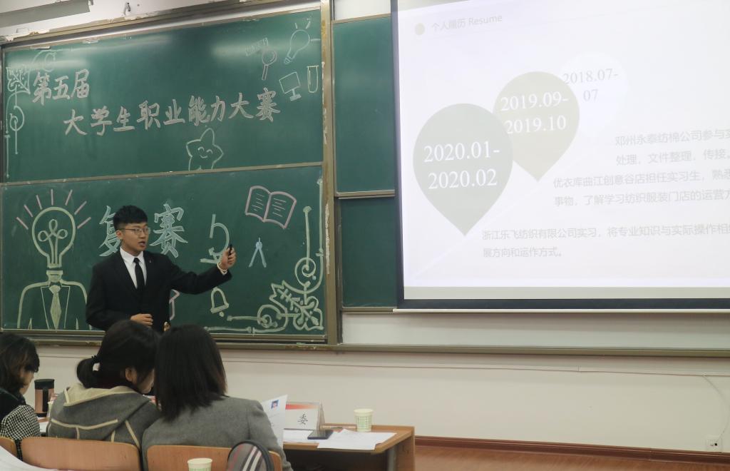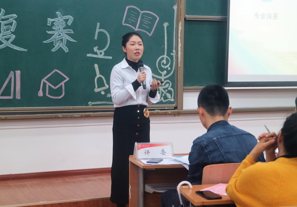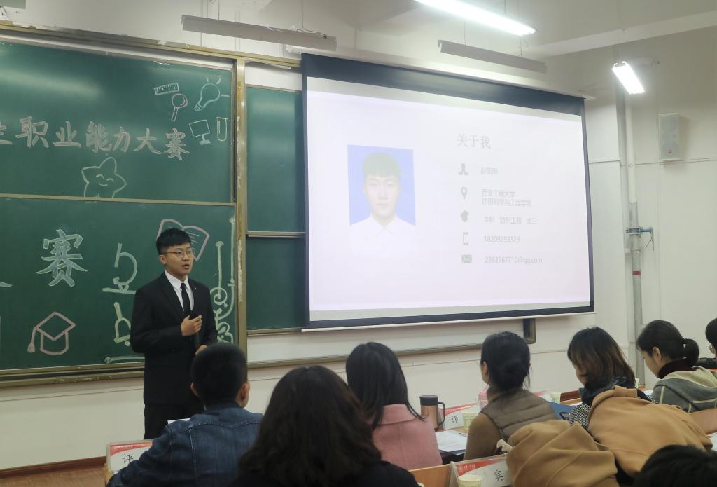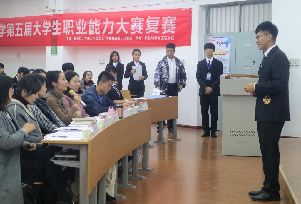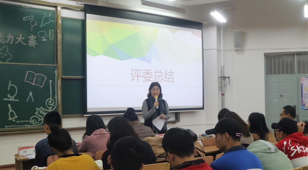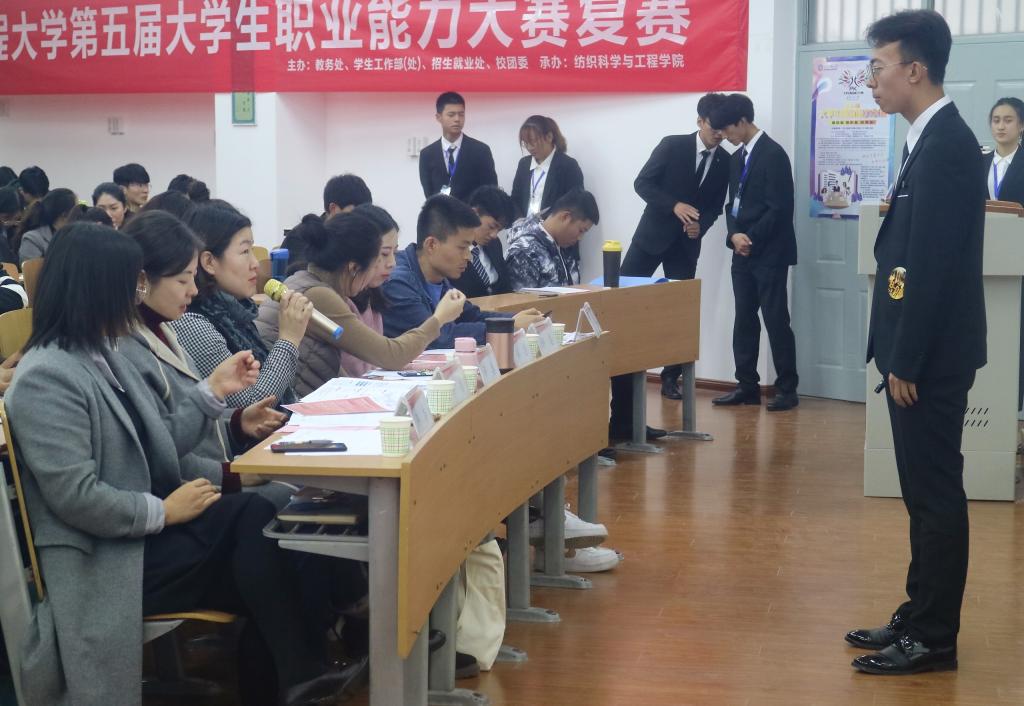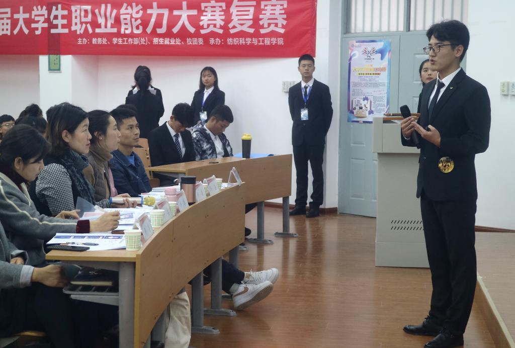 大赛伊始,主持人介绍到场评委及嘉宾,并宣布比赛正式开始。晋级复赛的13位选手通过“自我展示”“你问我答”两个环节向评委老师们展示自身风采。比赛选手来自不同公司、不同专业、不同年级,大家各具风格,表现出色。选手陈俊宇以其突出的表达能力、思维能力以及创新创业能力给在场评委、嘉宾留下深刻印象。选手李子龙模拟应聘纺织企业的品牌推广销售策划,在他的自我展示中不仅体现出他对纺织专业的了解,也表现出他对销售策划的灵活运用,在展示了个人专业技能的同时也充分的展现了他积极外向的性格特点。选手李慧敏应聘中学语文教师,在比赛中她自信大方的演讲博得了现场观众的阵阵掌声。比赛结束后,刘佳老师作总结点评。她指出了举办老员工职业能力大赛的重大意义,对本次大赛中选手们的精彩表现予以肯定。她希望同学们在大学里能积极参加各类竞赛活动,不断提升语言表达能力、沟通交流能力以及主动学习能力。最后,主持人宣布了晋级决赛的选手名单:陈俊宇、赵凯熙、梁凡超等八名选手,现场的嘉宾和评委为以上选手颁发晋级卡并表示祝贺。