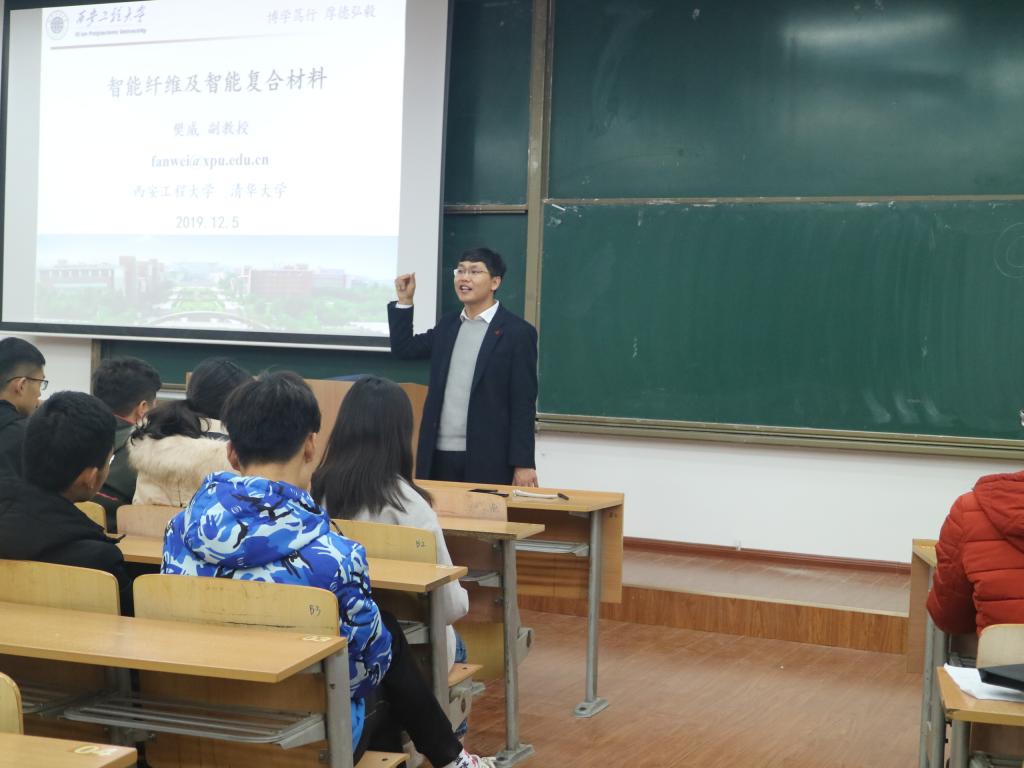 2019年12月5日,伟德国际victor1946在临潼校区B-133教室举行纺织启蒙论坛暨2019级新生生涯教育活动之导师聊专业第一期,伟德国际victor1946经理助理、纺织工程第四导师团导师樊威副教授作题为《智能纤维及智能纺织复合材料》的讲座。2019级全体员工聆听了讲座,讲座由2019级辅导员苏娜主持。
