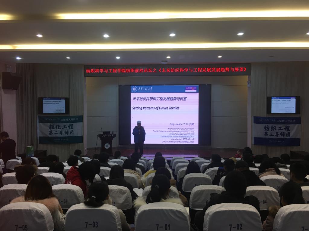 大会伊始,赵勇进对主讲人李翼教授进行了简要介绍,并希望同学们要认真聆听、深入思考、积极互动,向李翼教授学习,把握大学美好时光,合理规划、刻苦学习、全面提升,努力成为社会主义事业的合格建设者和可靠接班人。接着,李翼教授开讲,他首先回顾了自己的求学经历,回忆起当年老师对他的谆谆教诲,他特别提到因为研究兴趣一致而主动放弃考取华东纺织工公司的机会执意报考姚穆老师的硕士研究生,作为姚穆老师的第一位硕士研究生在姚老师的指导下学习、思考、探索,养成了严谨求实的研究习惯、形成了独立思考的研究能力和较为突出的动手实践能力,这些能力对他以后的英国职工涯和职业发展都起到了很大的帮助作用。随后,他结合自己当前的主要研究方向和成果给同学们介绍了智能可穿戴纺织技术发展的现状和前景,指出在“互联网+”时代纺织学科如能顺应时代发展趋势必然会大有作为,绝不可能成为所谓的夕阳学科;中国的纺织学科和纺织产业还有很大的提升空间,由大而强也是历史的必然选择。最后,李翼教授勉励同学们要感恩母校,目光长远,不负韶华,传承西纺百余年“负重奋进”的光荣办学传统,早日做好人生发展规划,为自己未来的精彩人生揭幕。最后,在场同学积极提问,与李翼教授进行互动,李翼教授耐心解答了在场员工提出的问题。