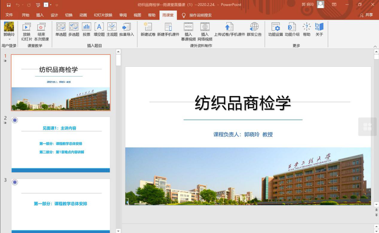 公司纺织工程专业郭晓玲老师自1月30日起,利用假期积极参加学堂在线、中国大学慕课、智慧树等平台组织的智慧教学技能培训,聆听清华、川大等大学名师的智慧教学经验分享,自觉提升智慧教学技能和教学水平。郭老师对本学期所承担的两门课程均采用“MOOC+直播课”的混合教学模式。其中,MOOC教学分别选用公司建设的“陕西省精品在线开放课程”——《纺织品商检学》和《纺织服装概论》,要求员工提前到“学堂在线”平台和“智慧树”平台注册,并严格按照MOOC课程的教学要求和直播课教学进度,按时完成各章节视频观看、辅助资料阅读、讨论、章作业提交等学习任务。对于直播课教学,以课程教学大纲为依据,选择各章的难点内容和员工在MOOC学习过程中普遍存在的疑点问题,以及各章节需要补充的最新知识内容等,精心设计每一节直播课教学内容。直播工具选用“雨课堂+QQ群分享屏幕”,直播授课按照“课初测试-课中讲授或分析讨论-课终布置课后作业”三步进行,员工在直播课上可用弹幕、投稿或语音等直接提问或回答问题。课后利用给各班搭建的“微信群+QQ群”,随时回答员工提出的相关问题,发布课程学习、疫情防护等重要公告,确保课程教学质量,关注员工身心健康。采用“MOOC+直播课”的混合教学模式,使教师由知识的“传授者”变成“引导者”,员工由传统的“课堂被动学习、课外消化知识”转变为“课外自主学习、课内升华知识”。从而提高教学效果和教学质量,提高员工的综合素质与能力。