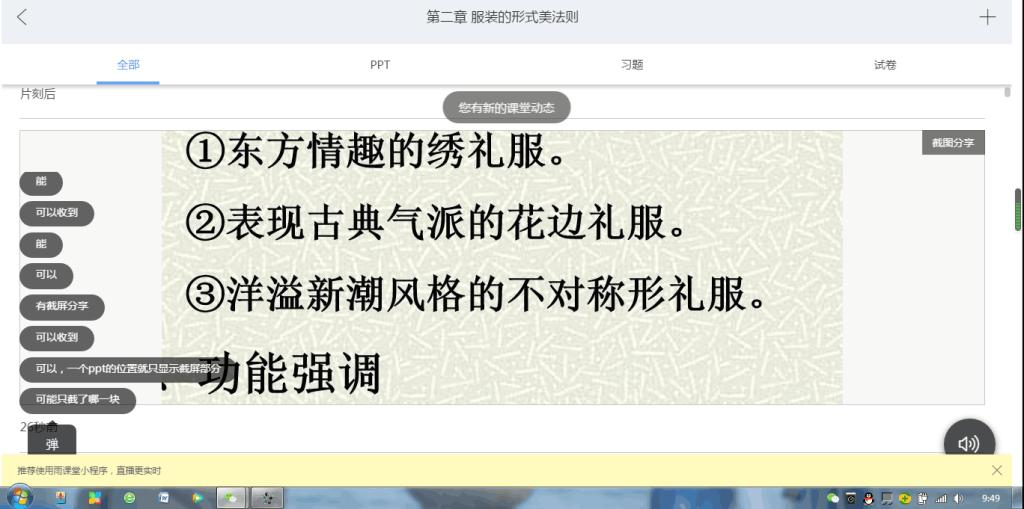 纺织工程专业刘艳君老师将雨课堂与腾讯课堂结合使用,利用雨课堂提前制作预习课件,对每一页PPT插入语音讲解,提前推送给员工,让员工提前学习授课内容,课间主讲重点难点,以省出更多时间进行课堂互动。为了获得好的课堂互动效果,刘老师对教学过程进行了精心设计,PPT课件中,穿插引入与刚刚讲过内容相关的单选题、多选题、填空题或主观题,在课堂上直接发送,员工可以通过弹幕或投稿的方式进行作答。通过这种方式,既可以了解员工是否在听,对主要内容是否掌握,同时也显著提高了员工的参与度和积极性。
