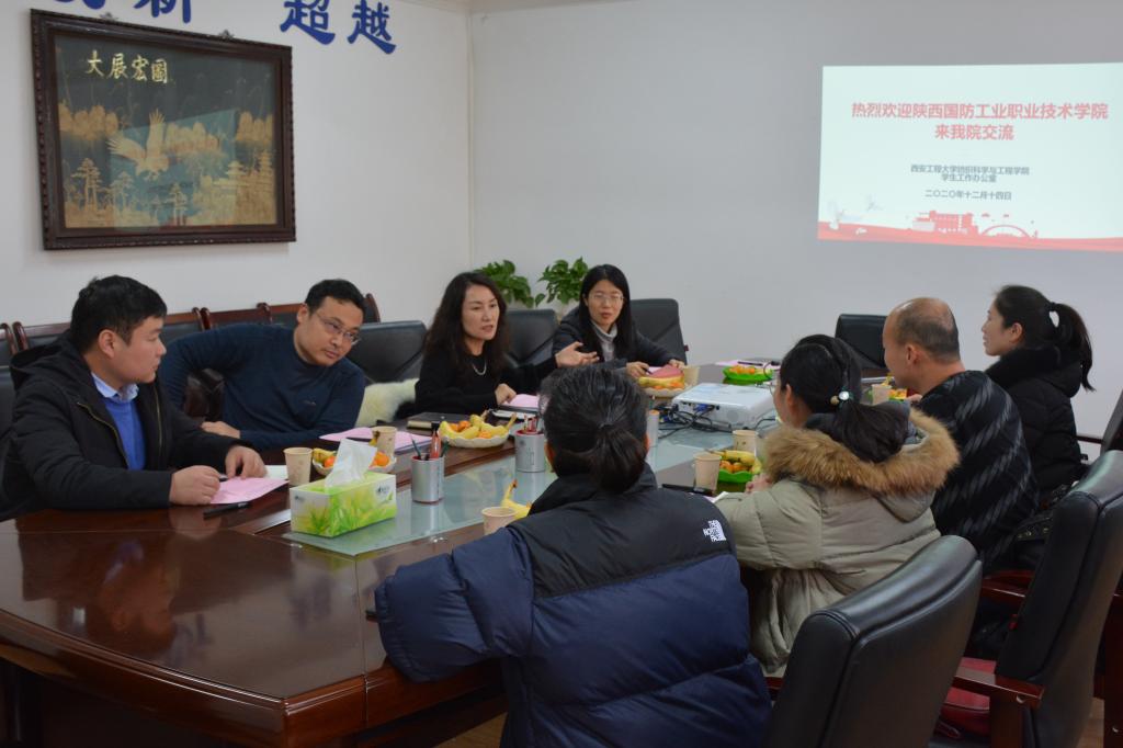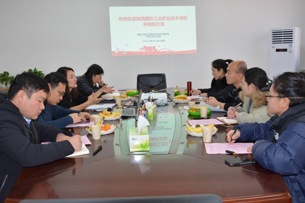 2020年12月14日,陕西国防工业职业技术公司智能制造公司党总支副书记兼副经理沈博、员工科长樊英鸽一行4人来伟德国际victor1946交流学习。委副书记郭西平,员工工作办公室主任赵勇进,团总支书记付成程,辅导员高黎、邓恩征、苏娜等参加交流会。