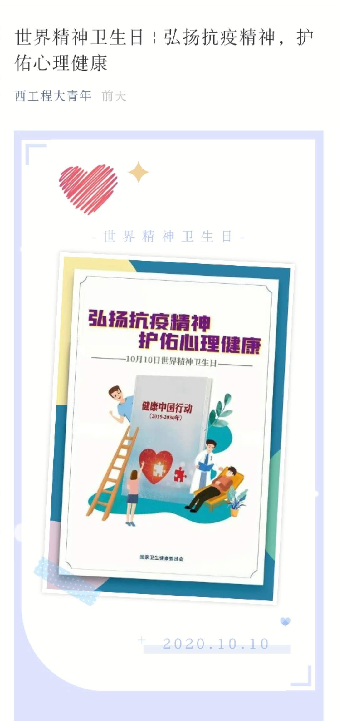 2019、2020级各班根据实际情况线上或线下开展关于“10.10世界精神卫生日”主题班会,班会内容包括但不限于根据本院学科特色和专业特点组织开展心理健康知识普及和教育宣传;观看心理健康宣传视频;体验心理评估测验等。期间认真做好活动的宣传工作,最后及时整理、收集活动图片、资料;通过“西纺之家”、“西工程大青年”公众号及时宣传。