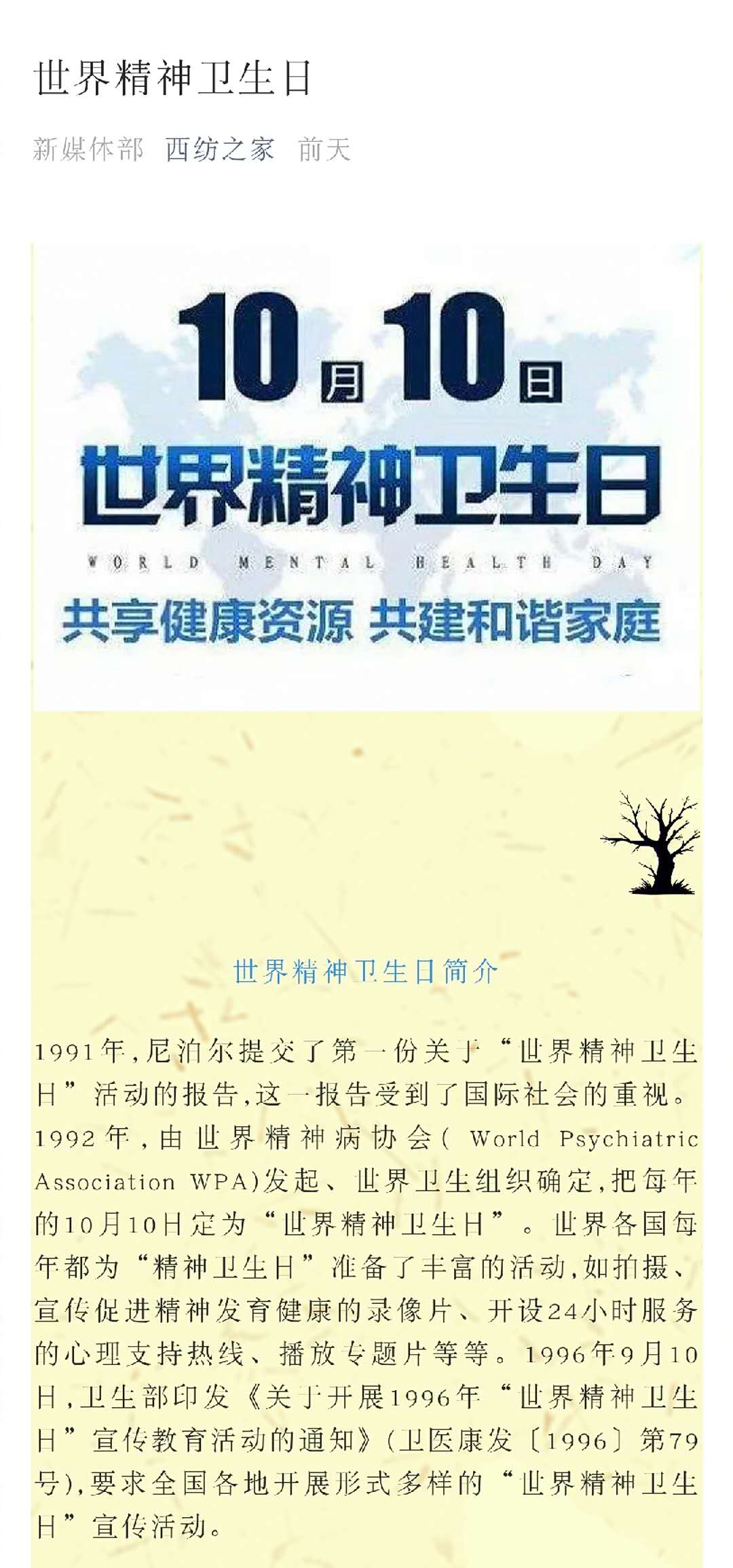 为进一步提升全民精神卫生和心理健康意识,倡导社会关注、支持精神卫生和心理健康工作,激励广大精神卫生和心理健康工作者做好新冠肺炎疫情相关心理疏导、心理干预等工作,伟德国际victor1946通过网络渠道对世界精神卫生日知识进行了科普宣传。进一步弘扬各地心理健康工作者在抗击新冠肺炎疫情中表现出的民族精神,提高公众对心理健康的重视程度。