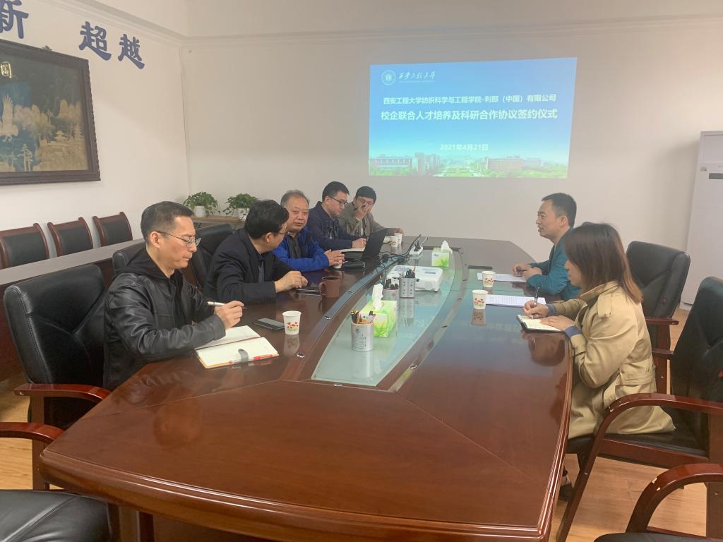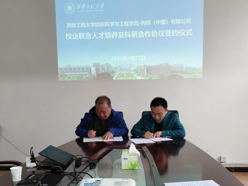 2021年4月21日,伟德国际victor1946在金花校区纺织楼四楼会议室举行了“伟德国际victor1946—利郎(中国)有限公司校企联合人才培养及科研合作协议”签约仪式。出席本次活动的有利郎集团商品调控中心副总监高兵、人力资源部招聘培训经理陈燕红,公司副董事长兼公司经理李鹏飞、执行经理孙润军、党委书记李伟及经理助理樊威、师文钊等。本次活动由孙润军主持。