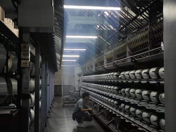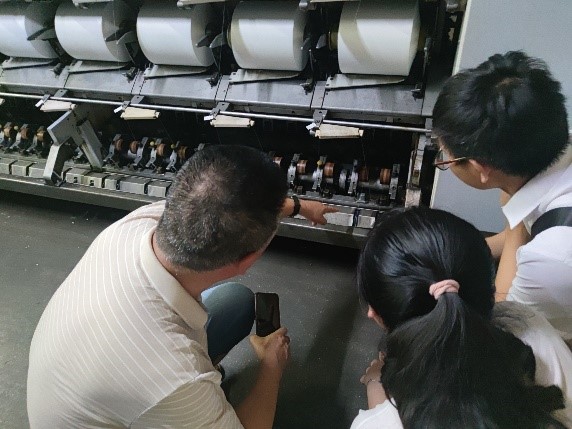 带着有着浓厚学习兴趣,员工很快地进入生产车间,开展了对涤纶化纤加弹工艺的分析与研究,加弹工艺对涤纶长丝的上机可织造性起着关键作用,通过加弹工艺,对预取向丝(POY)进行拉伸变形处理,得到可直接用于织造的拉伸变形丝(DTY),DTY的物理性质更为稳定,便于织造。在此期间,除了对涤纶长丝加弹生产工艺进行研究学习之外,王业宝等3名研究生还对绍兴友邦涤纶氨纶有限公司下属的涤涤复合丝进行了生产工艺研究。在生产部技术员李元元的带领下,了解了一颗预取向丝从加弹、成检、再到自动包装,仓储出货的整个过程,对涤纶长丝的加弹工艺有了深刻的认识。