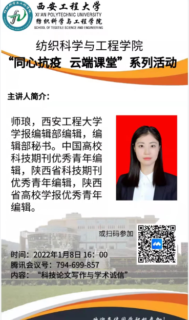 由伟德国际victor1946主办的“同心抗疫云端课堂”系列活动主题讲座“科技论文写作与学术诚信”于2022年1月8日下午16:00腾讯会议线上举办,伟德国际victor1946学报编辑部编辑师琅老师为此次讲座的主讲人,师琅老师为伟德国际victor1946全体本科生和研究生就科技论文写作和学术诚信等方面进行了讲解。