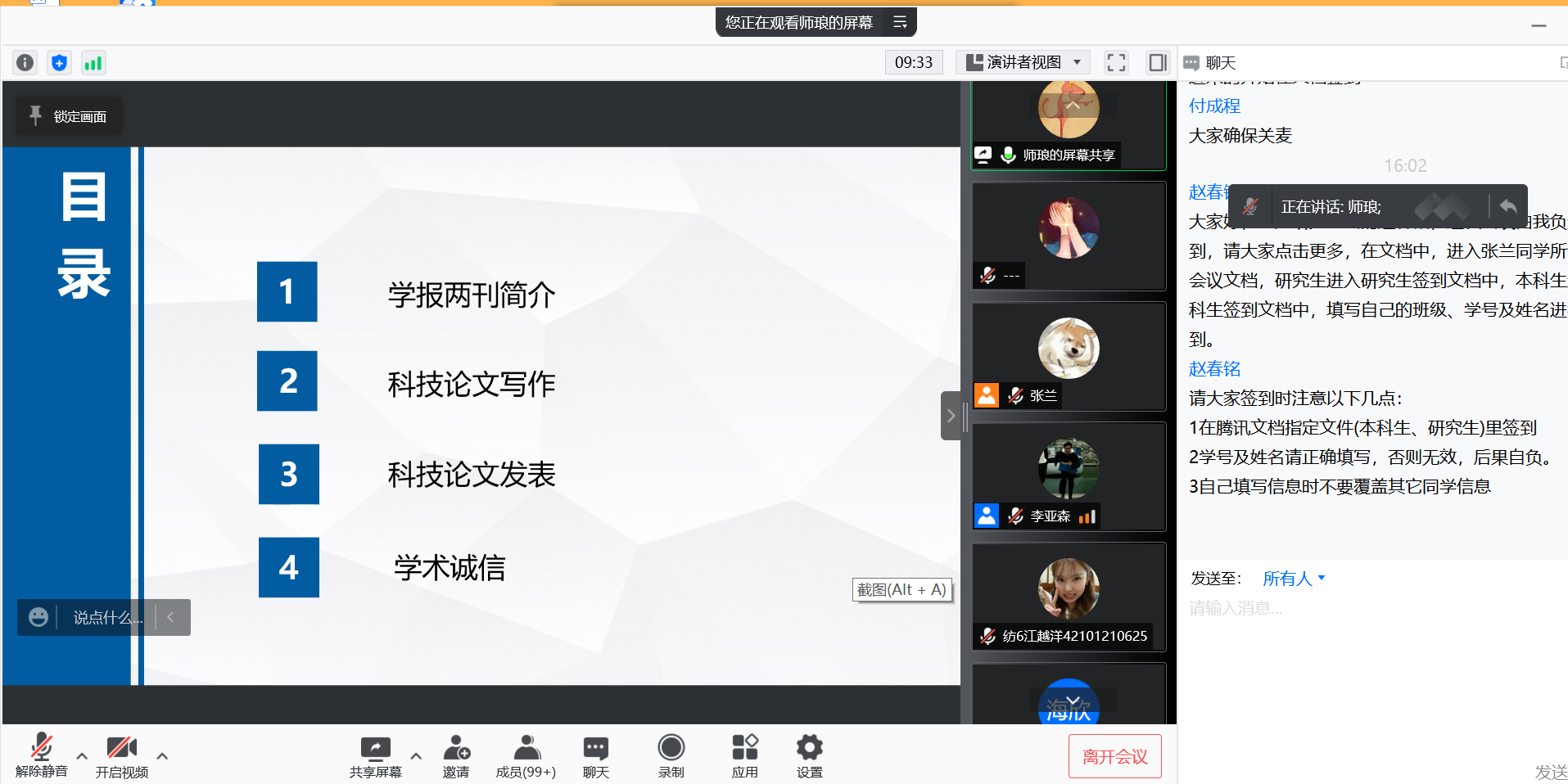 通过师琅老师主讲学报两刊简介、科技论文写作、科技论文发表、学术诚信四个方面的内容。同学们明白了一篇科技论文产生的过程,也学习到了科技论文中摘要、关键字、引言、正文、图表、结论、参考文献等的写作方法、论文发表时期刊的选择以及学术诚信问题。最后,师琅老师为同学们列举了常见的退稿原因并做出了相应提醒。