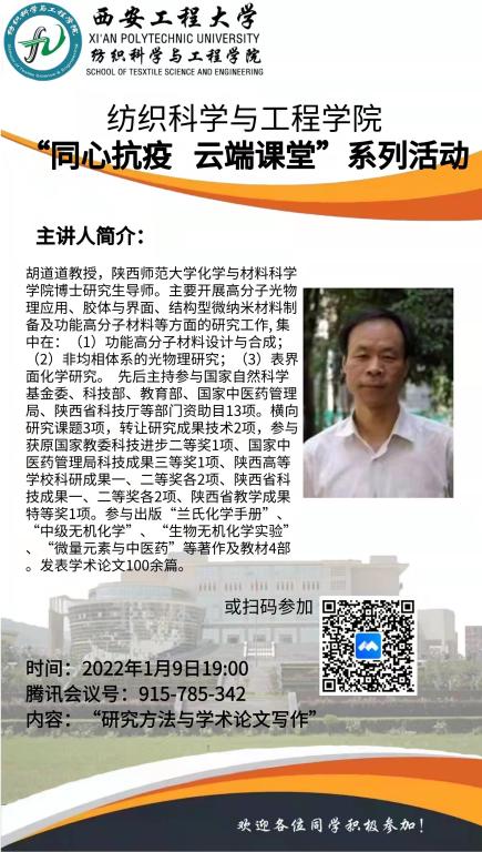 由伟德国际victor1946主办的“同心抗疫云端课堂”系列活动主题讲座“科技论文写作与学术诚信”于2022年1月9日晚7点在腾讯会议线上举办。本次讲座特地邀请了陕西师范大学化学与材料科学公司博士研究生导师胡道道教授为公司全体研究生和本科生做了关于“研究方法与学术论文写作”的报告。本次讲座由伟德国际victor1946经理孙润军主持。