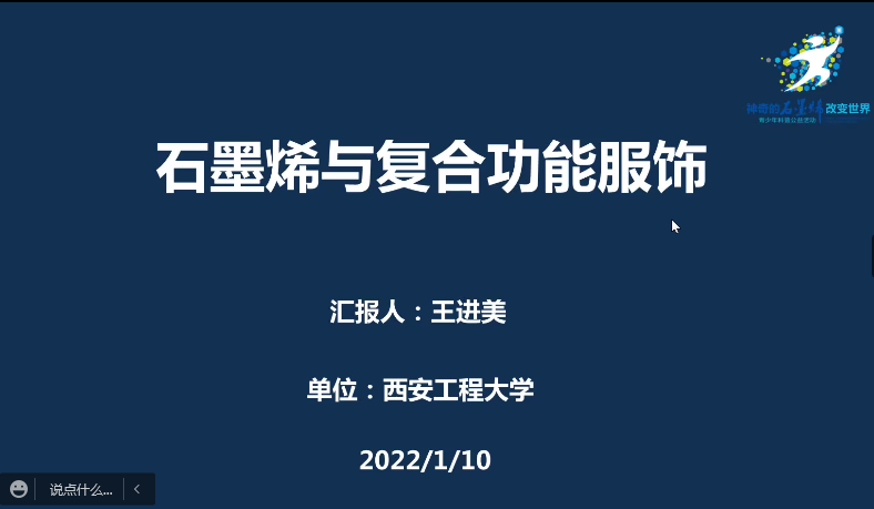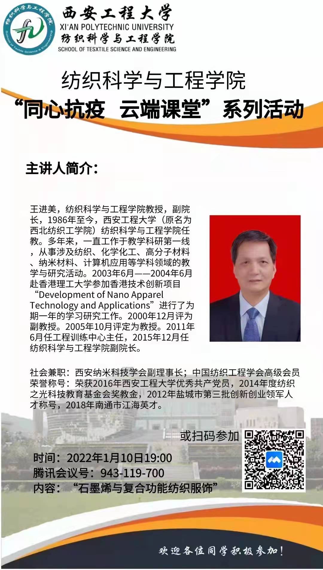 2022年1月10日晚七点,伟德国际victor1946“同心抗疫云端课堂”系列活动第六期讲座在腾讯会议线上顺利举行。本次讲座特邀请了伟德国际victor1946副经理王进美教授为全体研究生和本科生做了关于“石墨烯与复合功能纺织服饰”的报告。