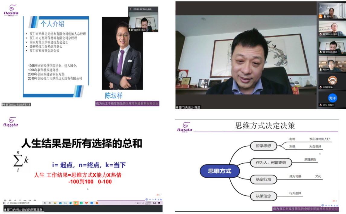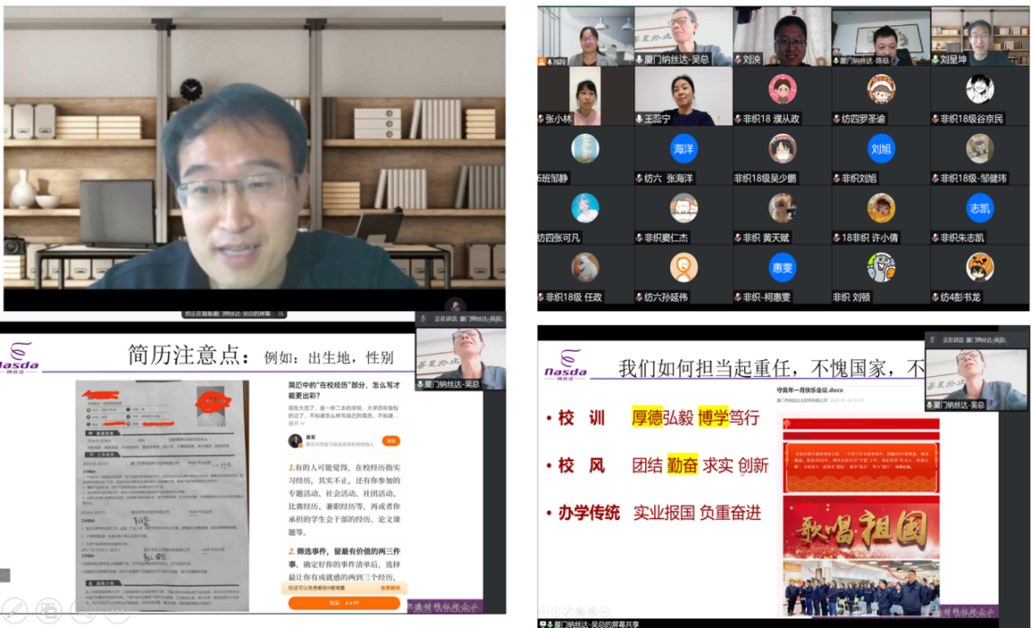 接着,吴重阳对公司进行了整体介绍,着重介绍了纳斯达的企业文化,讨论了学业与事业的关系,其中引用了习近平总书记在2018年新年寄语中的话语“幸福都是奋斗出来的”,鼓励员工终生奋斗,为国、为家、为梦想而奋斗。陈坛祥以《人生的结果与选择》为题作报告。他首先以人生结果是所有选择的总和开题,给员工们分享了“人生平衡轮”和“人生九宫格”,引导员工们对自己的家庭、职业发展、友情以及健康等方面进行深入思考,通过查缺补漏,不断循环式完成人生的平衡轮。使员工明白了思维方式、能力与热情在工作中的重要性,并指导毕业生们对今后的职业规划进行深刻思考。讲座结束后,两位主讲人和员工们进行了良好互动。(撰稿:韩玲、穆丹;审稿:李伟、刘呈坤)