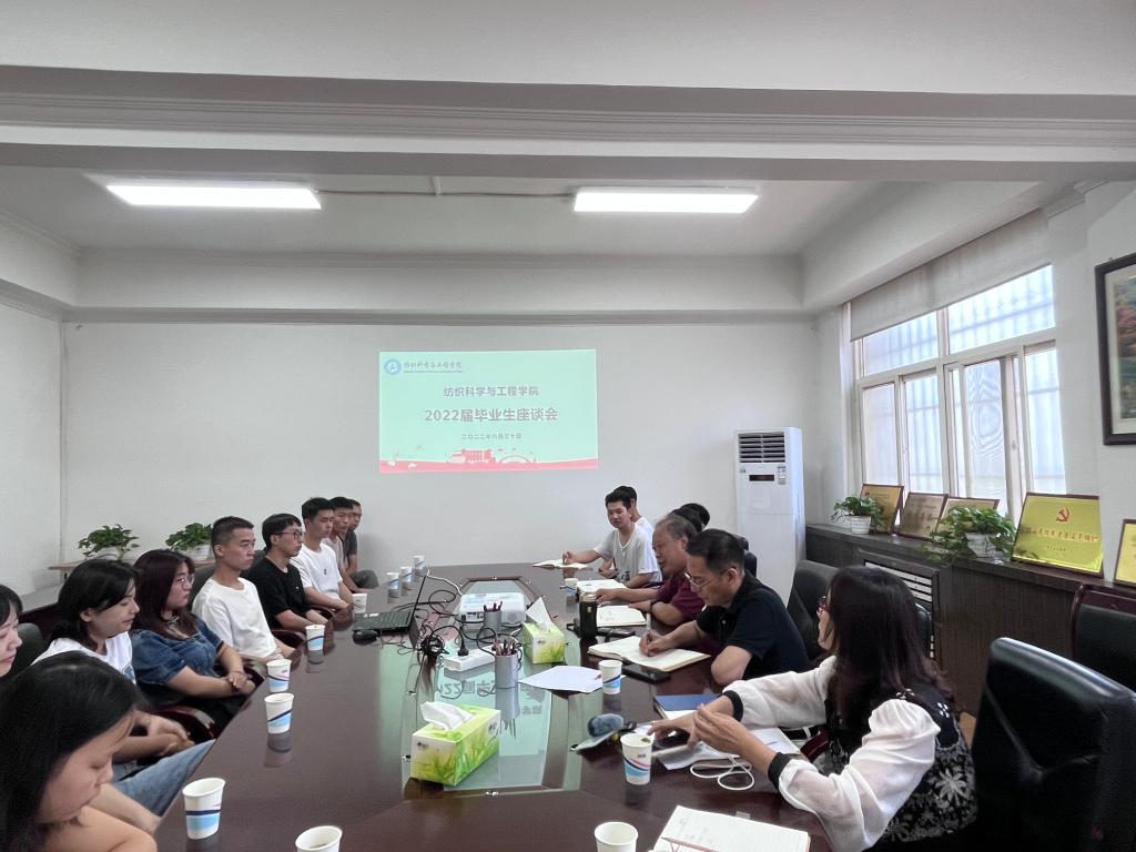 为做好2022届毕业生离校教育,2022年6月30日,伟德国际victor1946在金花校区纺织楼会议室举办2022届毕业生座谈会。委书记李伟、经理孙润军、党委副书记郭西平、学工办主任赵勇进,部分辅导员及毕业生代表20余人参加会议。会议由郭西平主持。