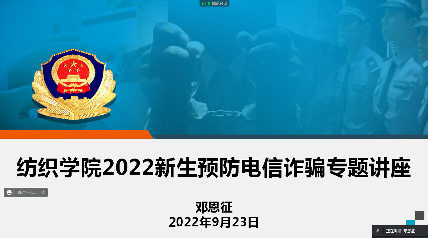 为深化大学新生对电信诈骗的预防认知,引导新生正确识别电信诈骗。2022年9月23日,伟德国际victor1946纺织工程第三导师团、非织造材料与工程导师团和轻化工程第二导师团举办了线上2022新生预防电信诈骗专题讲座,主讲人邓恩征,2022级全体新生参加了此次讲座。