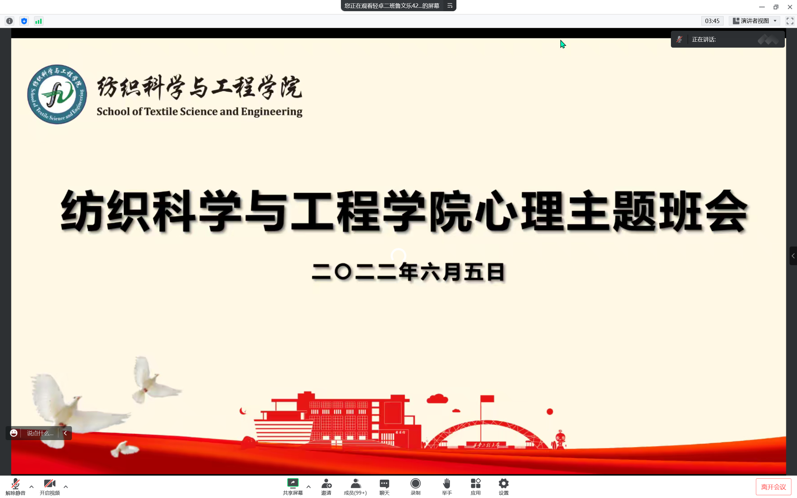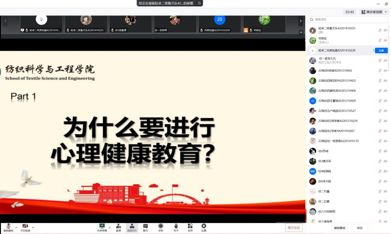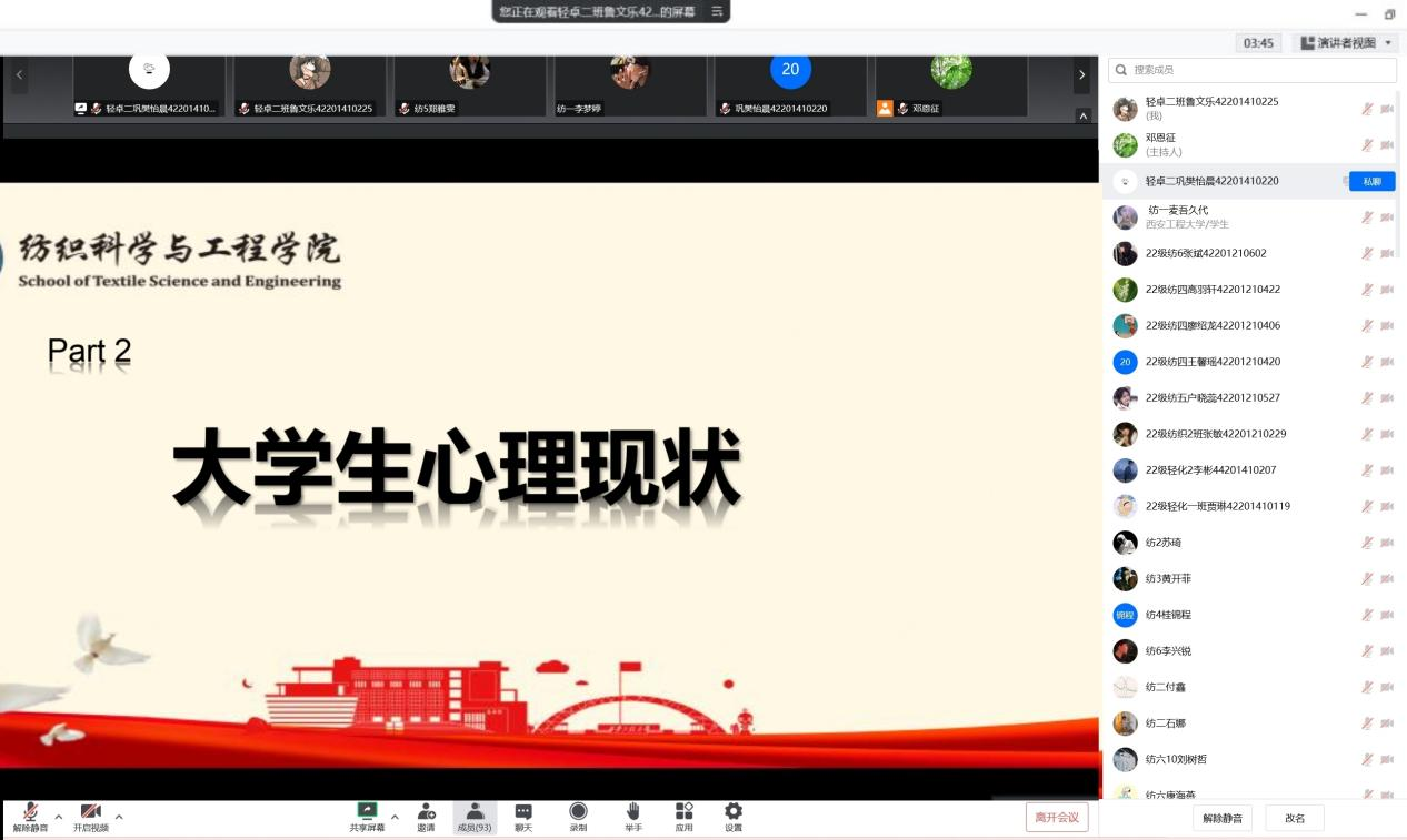 班会开始,2018级纺织工程1班苗驰结合社会调查数据给同学们介绍了心理健康的相关知识,并针对大四所面临的心理困境和学业压力分享交流合理的自我调节方法。如:打篮球、学习新技能等。分享环节结束后,邓恩征总结:老员工活固然精彩,但也不免会产生负面的情绪,我们要学会正确积极地应对负面情绪,将注意力放在自己身上,不给自己设限,不断提升自我。邓恩征享心理健康知识的同时也带领同学们找寻应对大四就业、论文等多重压力下的情绪管理的方式。最后,邓恩征介绍公司老员工心理健康教育与咨询中心概况及2022年心理育人宣传季主题活动,鼓励员工积极参与。