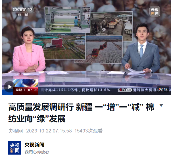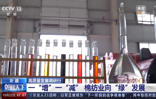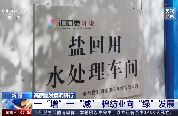 2023年10月22日,央视新闻客户端进行了题为“高质量发展调研行丨新疆:一朵棉花“链”起产业集群”的新闻报道,“朝闻天下”栏目就“新疆一‘增’一‘减’棉纺业向‘绿’发展”进行了专题报道。报道就库尔勒汇同泰印染科技有限公司的深度节水减排染色新技术及盐回用技术进行了重点报道。