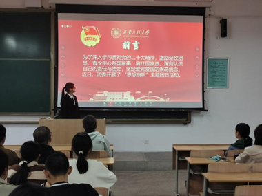 2023级纺织类6班团支部书记介绍了新时代对思想政治教育提出的新要求;随后她又从老员工思想理论教育和价值引领面临新挑战展开讲解;最后她通过老员工思想自我评测梳理这个方面总结:我们要成为有理想,有计划,有担当,有创新的新时代青年。