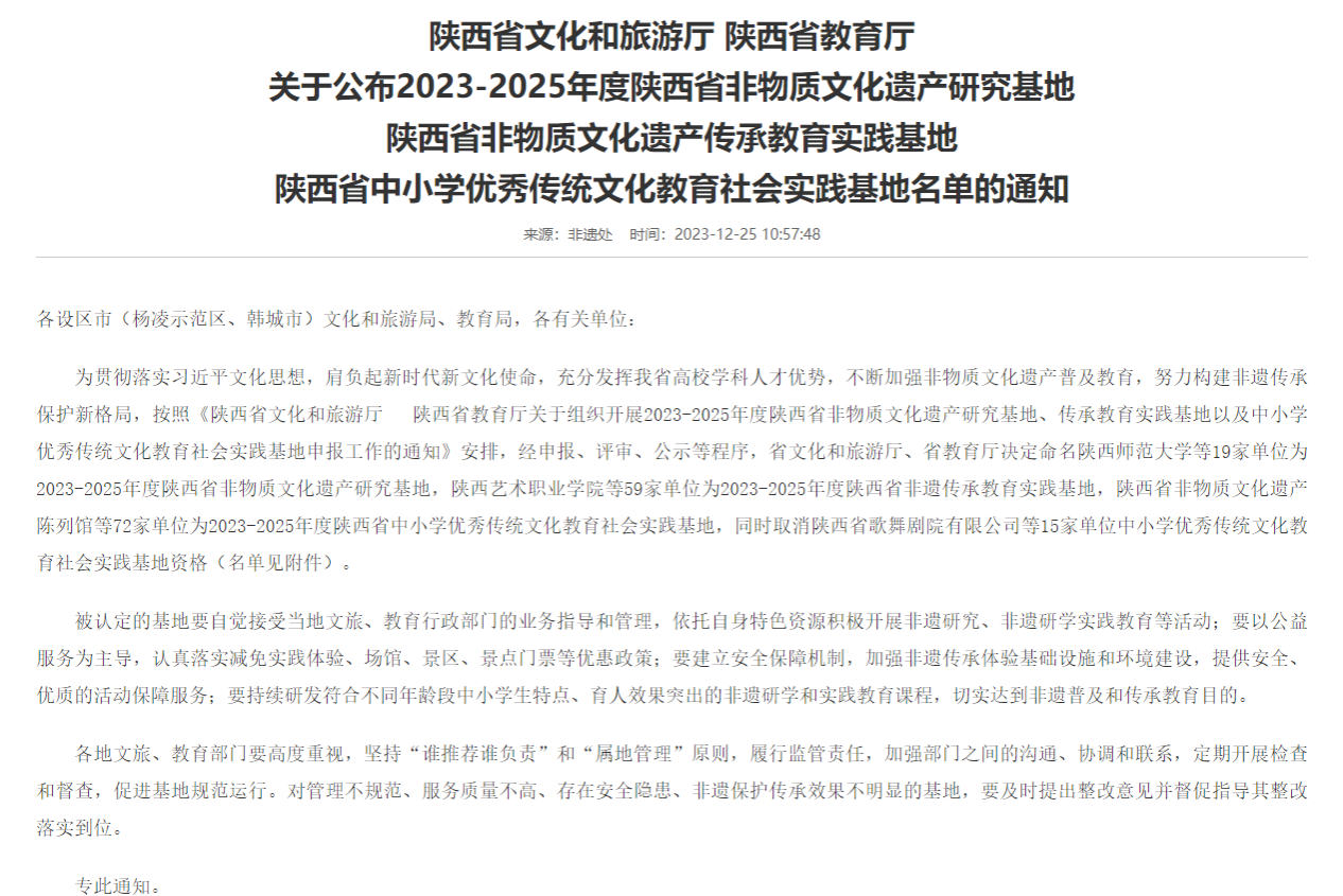 本次2023-2025年度陕西省非物质文化遗产传承教育实践基地申报,经评审、公示等程序,最终共有59家单位被认定为2023-2025年度陕西省非物质文化遗产传承教育实践基地。