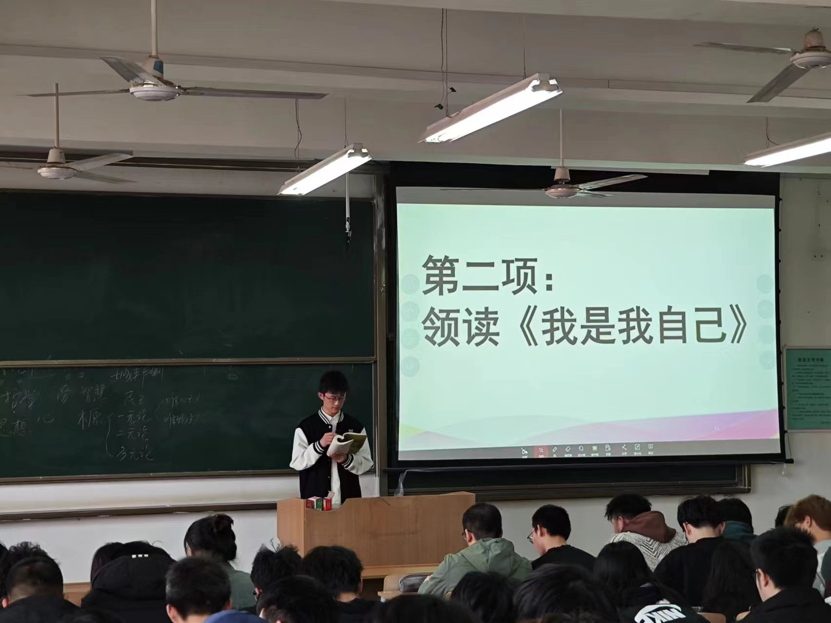 其次,丁建凯带领大家朗读励志诗歌《我是我自己》,激励大家解开自卑情结,积极乐观地面对生活。