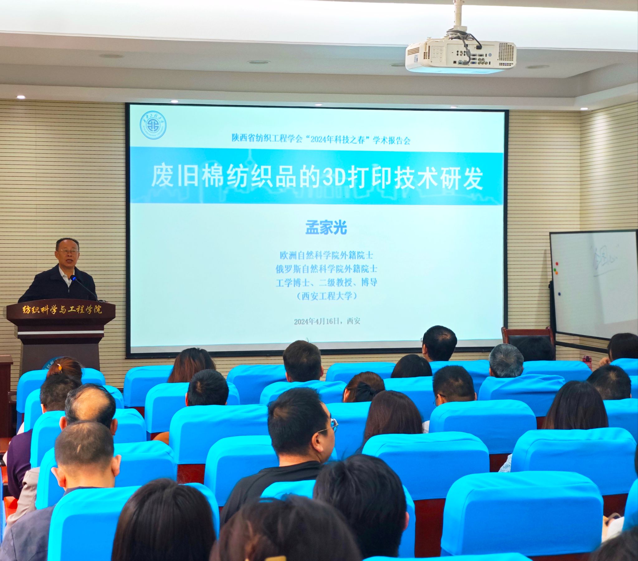 2024年4月16日,陕西省纺织工程学会“2024年科技之春”学术报告会在伟德国际victor1946姚穆报告厅举办,伟德国际victor1946孟家光教授作题为《废旧棉纺织品的3D打印技术研发》的学术报告。陕西省纺织工程学会秘书长莫西、30余名专家和技术人员,伟德国际victor1946教师代表及70余名研究生参加本次学术报告会。