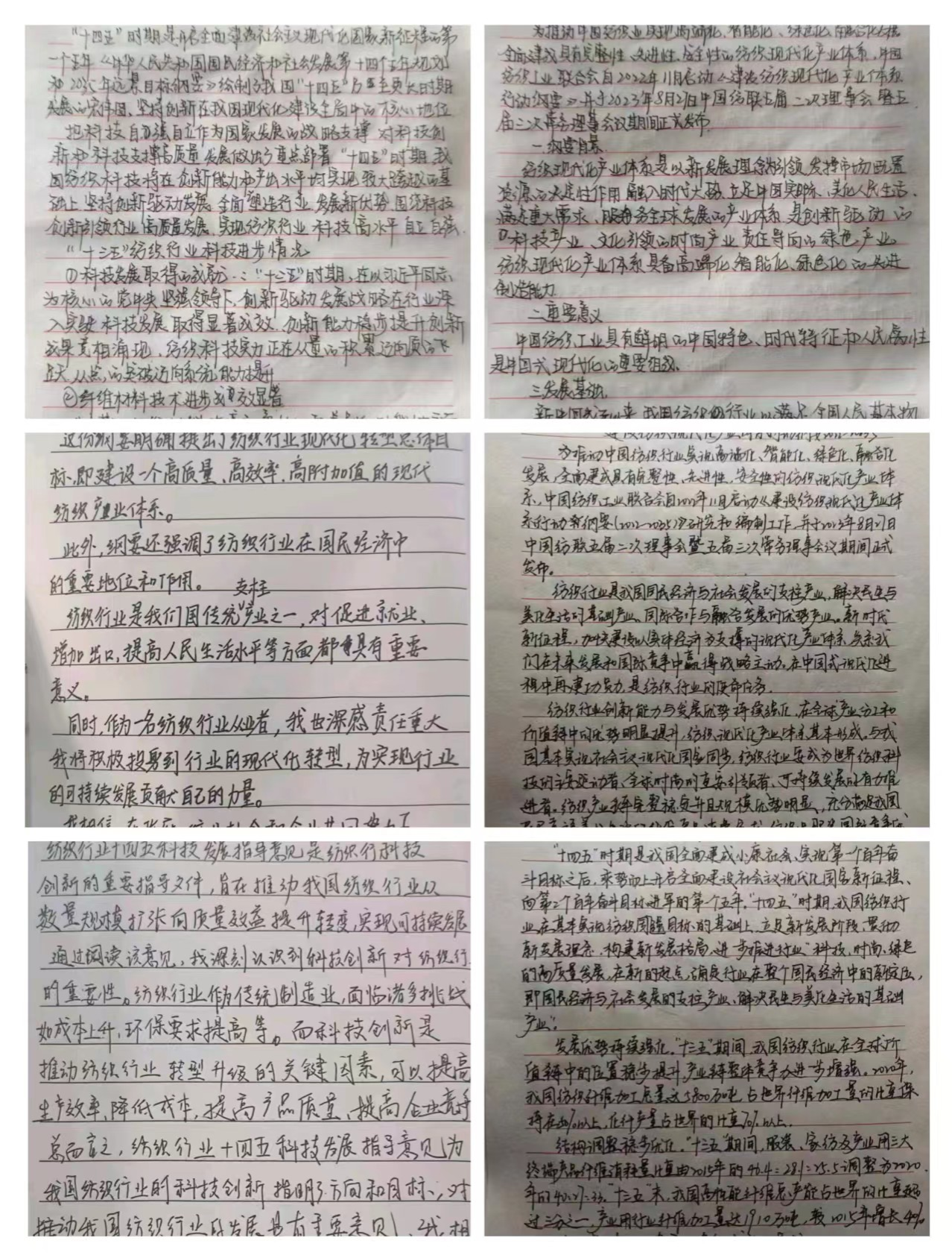 与会员工通过分享自己的学习笔记,生动地展现了对于《纺织行业“十四五”科技发展指导意见》和《建设纺织现代化产业体系行动纲要2022-2035年》的深入思考与理解。参与者们不仅呈现了对政策文件内容的把握,更就未来纺织行业的发展方向提出了独到的见解。