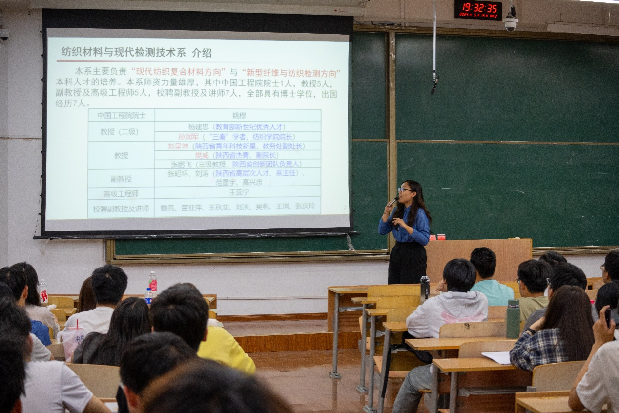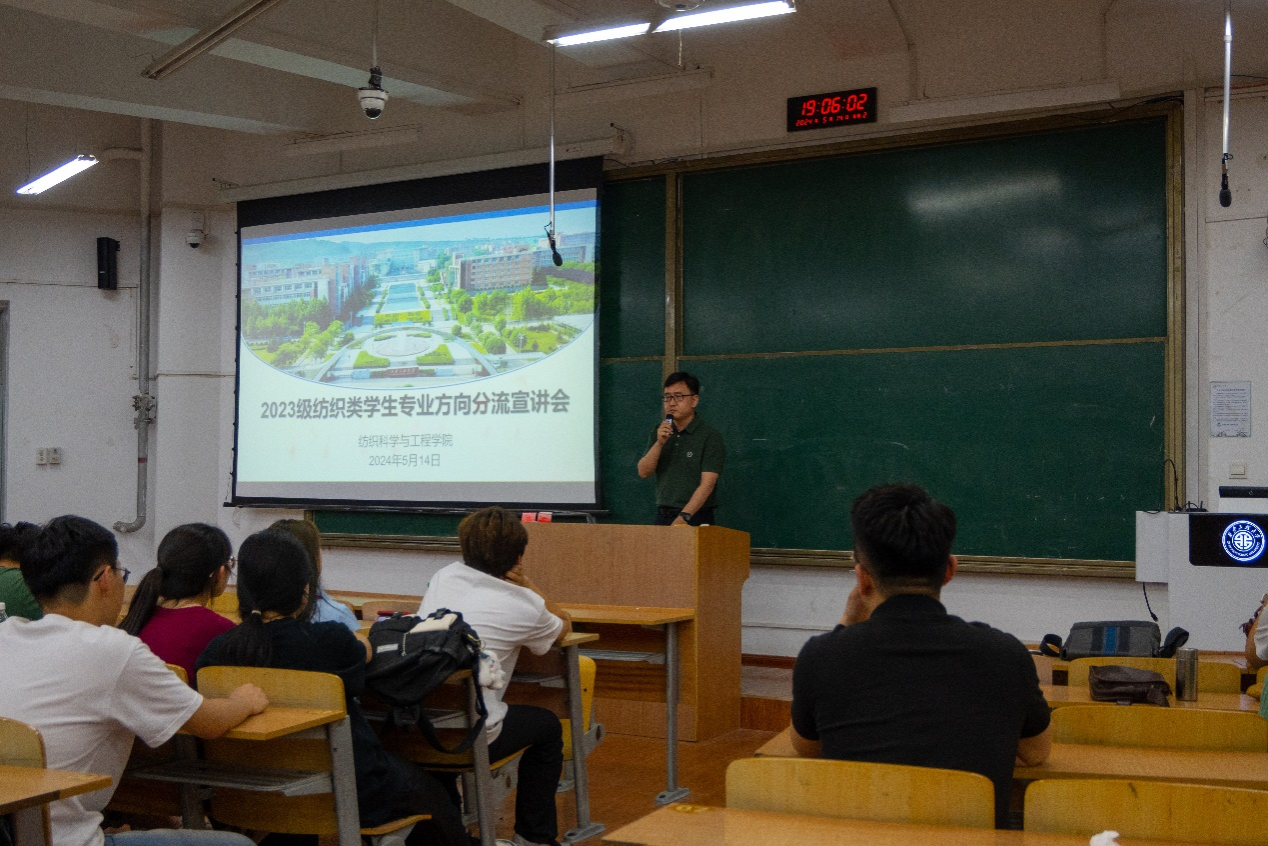 2024年5月14日晚,伟德国际victor1946在临潼校区组织召开2023级纺织类大类招生专业分流宣讲会。公司副经理师文钊、纺织工程专业负责人谢光银、非织造材料与工程专业负责人韩玲、纺织工程专业现代纺织技术与贸易系副主任申国栋、纺织品功能与时尚设计系副主任董子靖、智能针织与生态服装系主任薛涛、纺织材料与现代检测技术系副主任范星宇、2023级辅导员赵森老师及2023级纺织类全体员工参加会议,会议由范星宇主持。