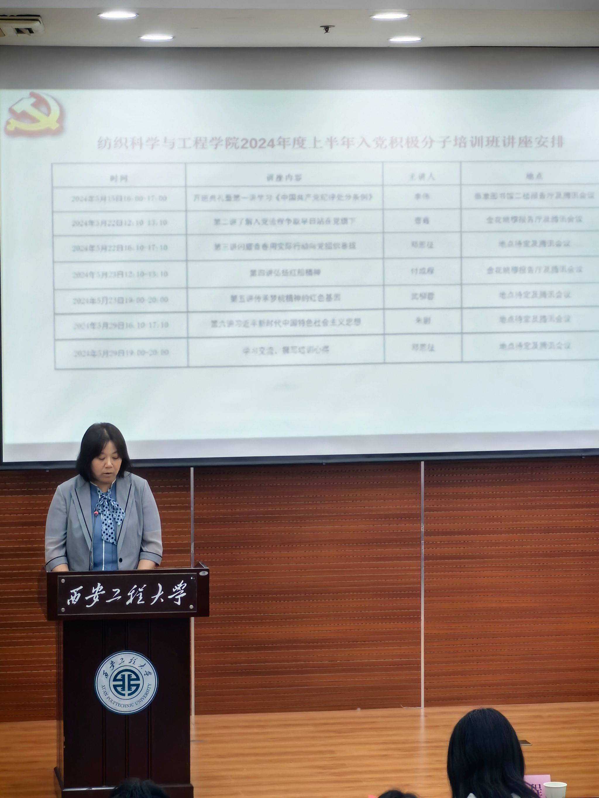 本次会议由付成程主持。伴随着雄壮激昂的国际歌声,开班仪式正式开始。接着,朱宇军宣读了《伟德国际victor1946关于举办2024年上半年入党积极分子培训班的意见》。学员代表2023级卢华山同学表态发言,他表示将珍惜学习机会、提高自身素质、遵守培训纪律、端正入党动机、发挥模范作用、始终保持对党的忠诚和对人民的热爱,在学习生活中不断提高自己的政治觉悟和业务能力,勇于创新、甘于奉献、精益求精,同时作为纺织人要积极将“梦桃精神”传承下去,让“梦桃精神”进一步发扬光大。